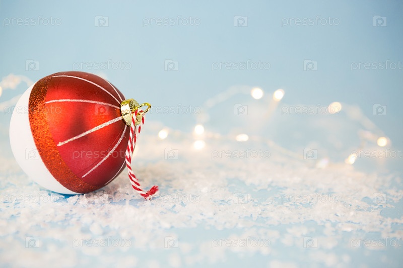 Красный елочный шар на синем фоне с искусственным снегом и огнями гирлянд в боке. Праздничный фон, новый год. Копировать пространство