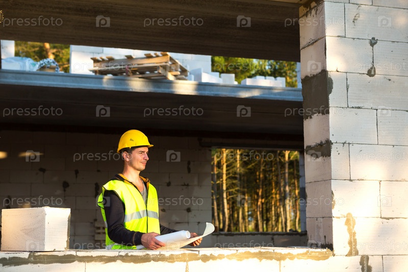 Инженер-строитель и дизайнер в желтой каске изучает чертеж здания на строительной площадке. Дом из пористых бетонных блоков, рабочий в процессе у окна и стены