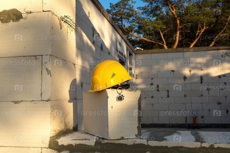 Строительная желтая каска и ключ от дома на окне жилья из блоков пористого бетона. Строительство под ключ, будущий дом, проектирование, строительство. Безопасность труда. Копировать пространство
