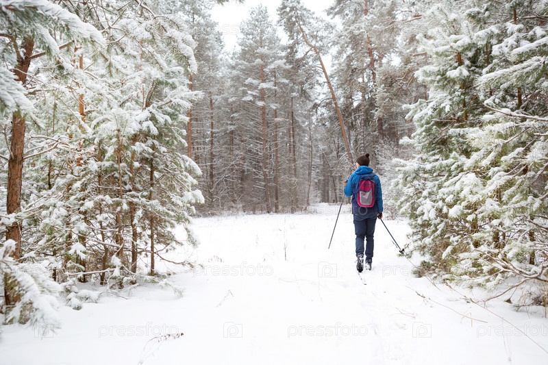 Лыжник с рюкзаком и шляпой с помпоном с лыжными палками в руках на фоне заснеженного леса. Лыжные гонки в зимнем лесу, спорт на открытом воздухе, здоровый образ жизни, зимний спортивный туризм