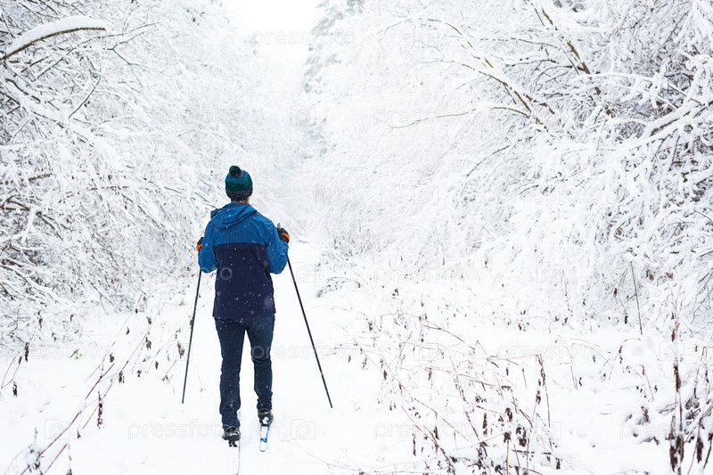 Лыжник в ветровке и шляпе с помпоном с лыжными палками в руках спиной на фоне заснеженного леса. Беговые лыжи в зимнем лесу, спорт на открытом воздухе, здоровый образ жизни
