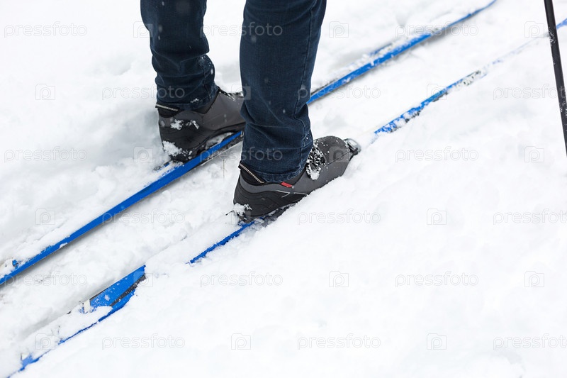 Ноги лыжника в лыжных ботинках на беговых лыжах. Прогулки по снегу, зимние виды спорта, здоровый образ жизни. Крупный план, копипространство