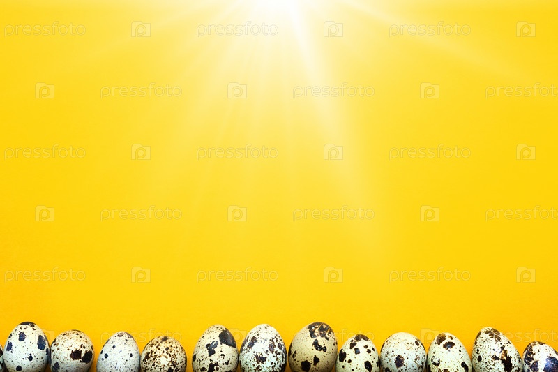 Пятнистые перепелиные яйца на желтом фоне по нижней границе кадра. Пасхальный весенний фон. Копирование пространства, баннер