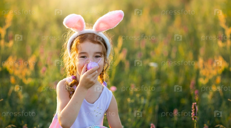 Милая забавная девушка с крашеными пасхальными яйцами весной на природе в поле с золотым солнечным светом и цветами. Праздник Пасхи, пасхальный кролик с ушами, разноцветные яйца в корзине. образ жизни