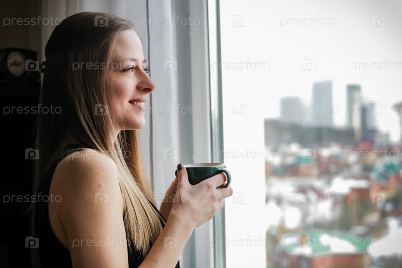 Красивая молодая блондинка пьет кофе или чай из кружки, улыбается и смотрит в окно. Вид на город с высоты, отдых дома, спокойствие