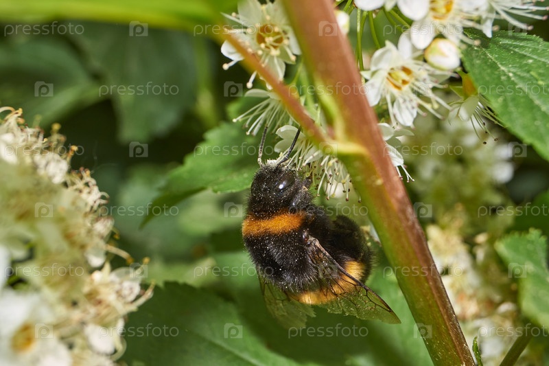 Шмель собирает пыльцу и нектар с цветков куста спиреи