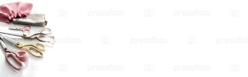 Баннер: раскладка из портновских ножниц, разложенных веером с лоскутами тканей с красивыми жесткими тенями на белом фоне
