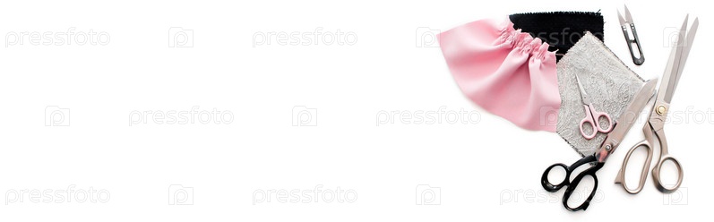 Баннер для оформления сайта и блога: с правой стороны расположены инструменты для шитья одежды и лоскуты ткани