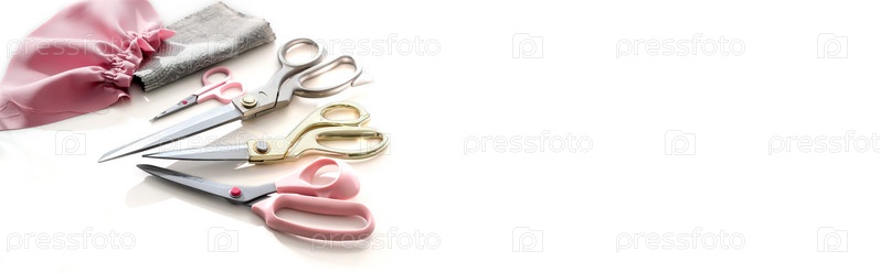 Раскладка из портновских ножниц, разложенных веером с лоскутами тканей с красивыми жесткими тенями на белом фоне в серо-розовой гамме