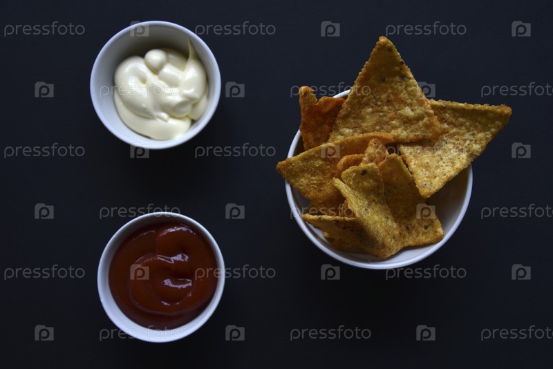 Вкусные острые начос на тарелке с соусами на черном фоне. Вкусная закуска с кукурузными начос крупным планом
