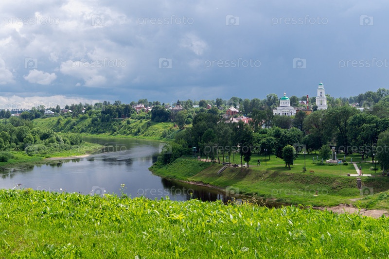 Вид на город, Оковецкой собор, сквер воинов-интернационалистов и реку Волгу во Ржеве, Тверская область, Россия