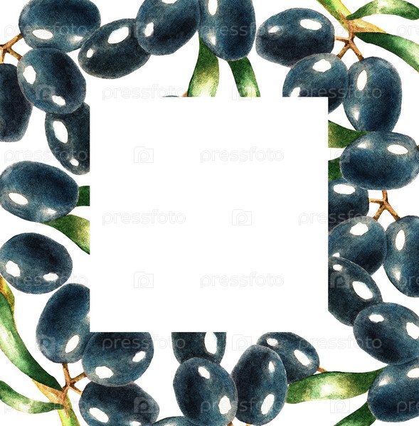 Черная оливковая ветвь, акварель, квадратная рамка