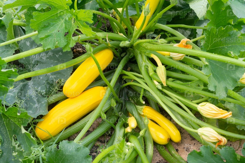 Куст с желтыми кабачками в огороде