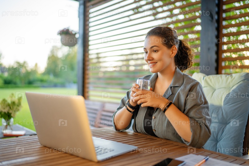 Женщина работает сидя во дворе