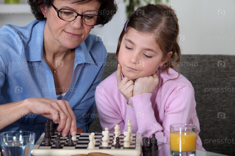 Девочка и ее бабушка играют в шахматы