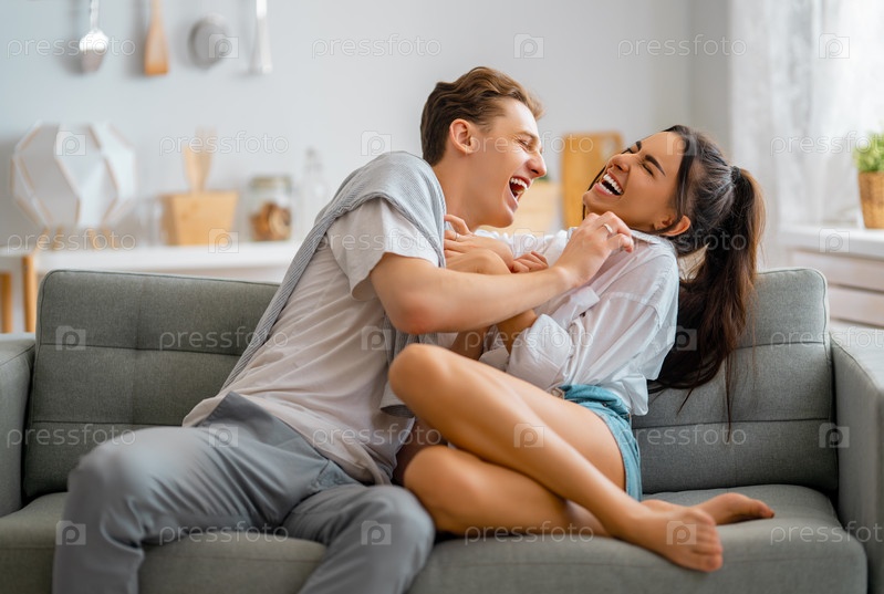 Пара веселится и обнимается дома