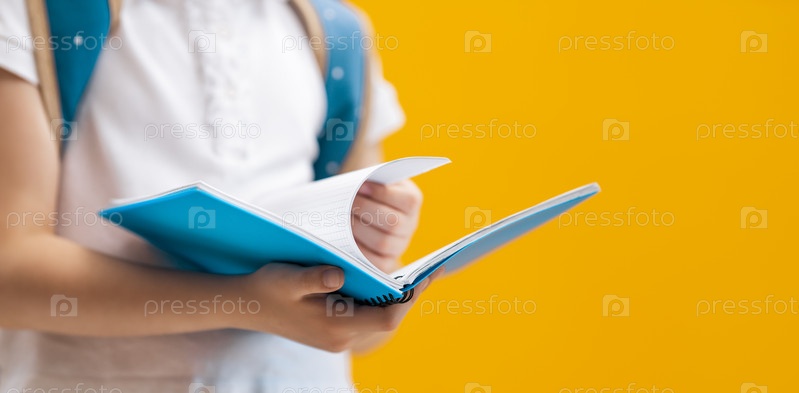 Ребенок с книгой на фоне желтой стены