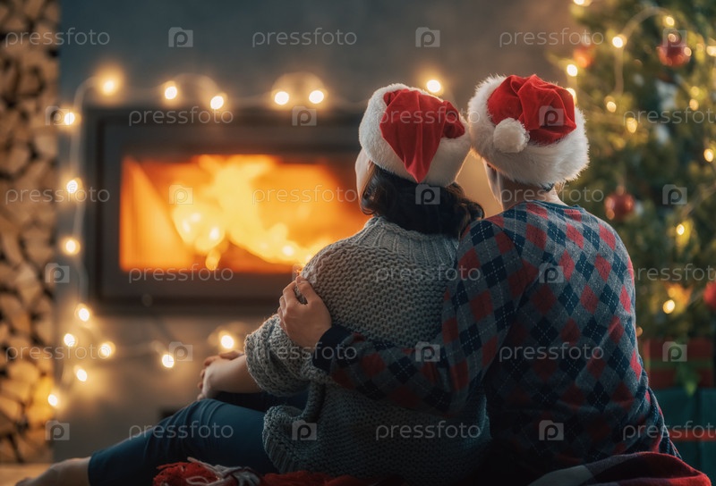 Пара отдыхает возле елки