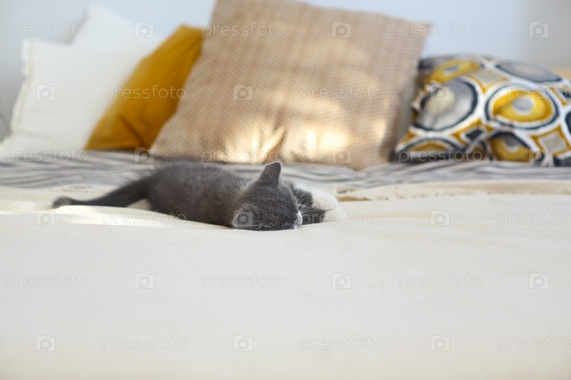 Милый британский короткошерстный котенок спит на кровати