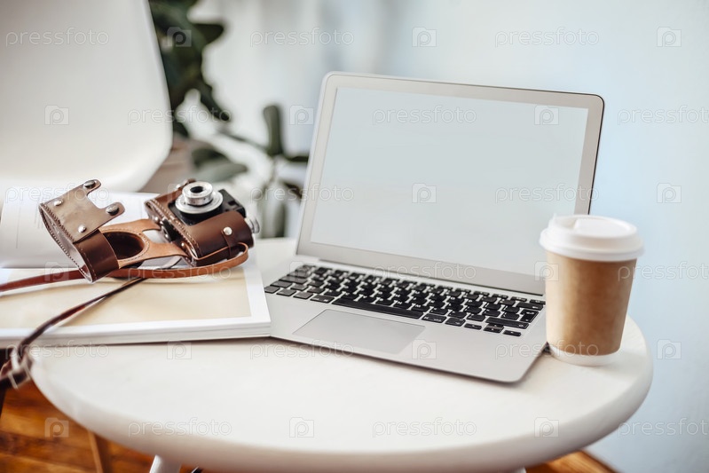 Фотокамера и кофе рядом с ноутбуком и журналом