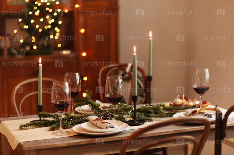 Свечи и вино на рождественском столе