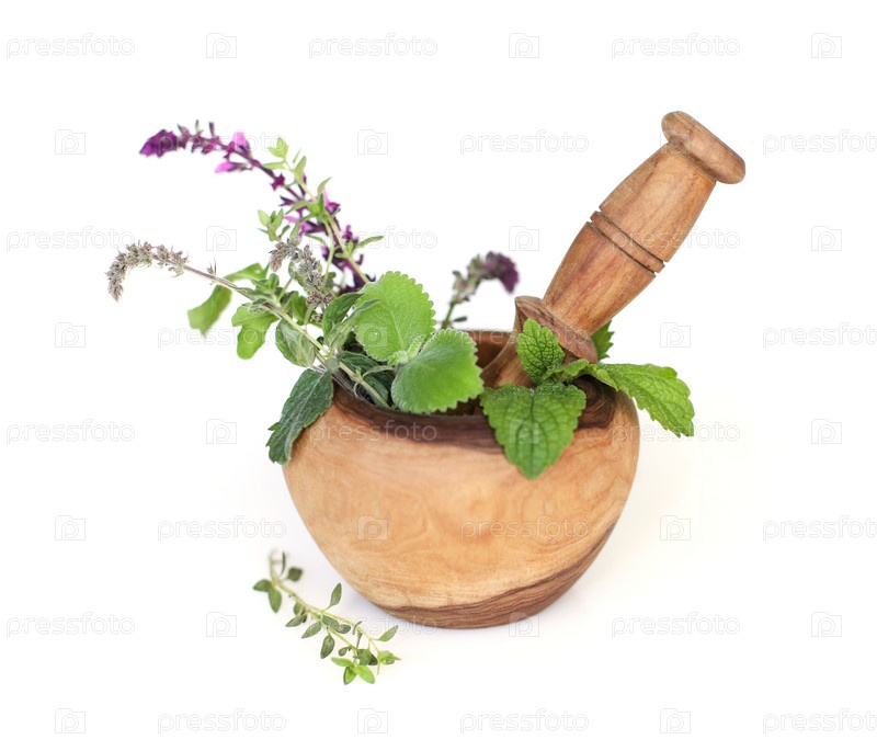 Травы и пестик в ступке
