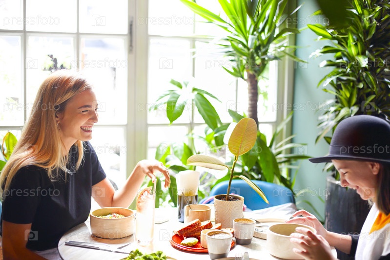 Счастливые молодые девушки встречаются на обеде в кафе