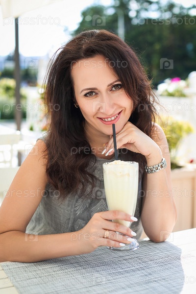 Молодая красивая брюнетка наслаждается кофе латте