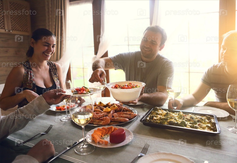 Стол с белым вином, креветками, салатом и гратеном