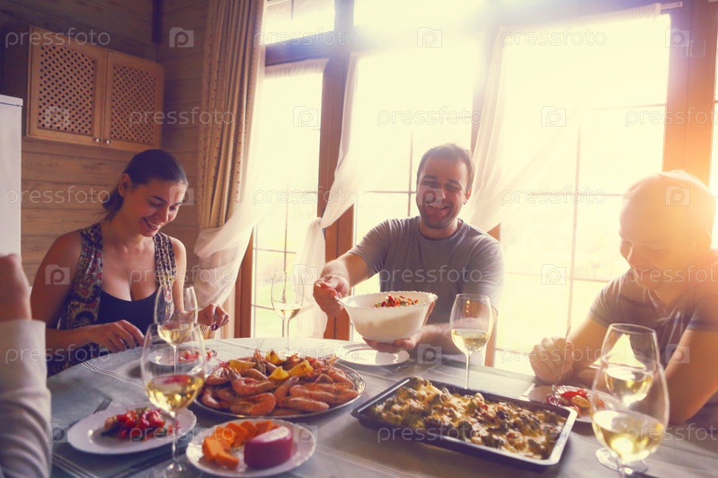 Стол с белым вином, креветками, салатом и гратеном