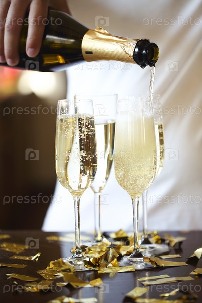 Флейты шампанского на фоне золотой искры с золотым конфетти. Мужчина наливает игристое вино
