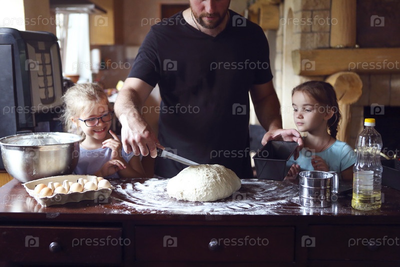 Дети готовят домашний хлеб с отцом