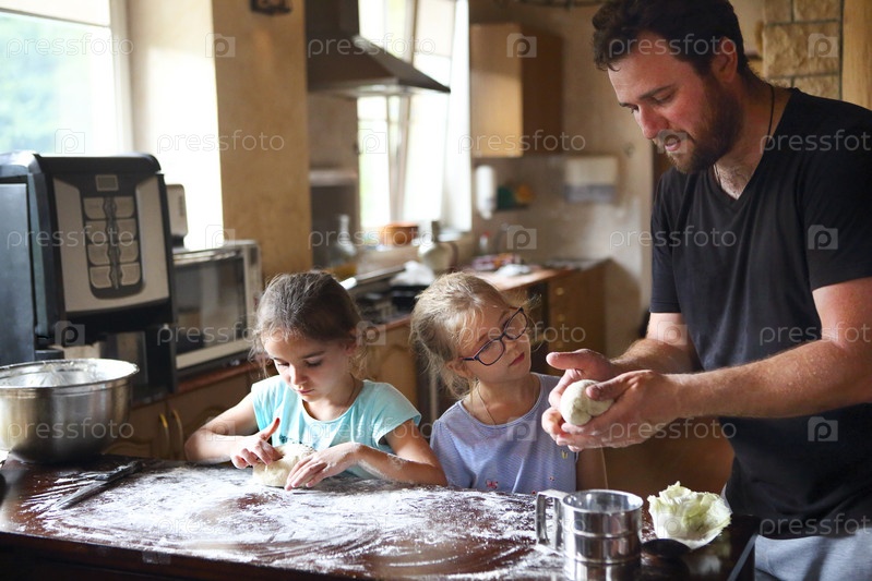 Дети готовят домашний хлеб с отцом