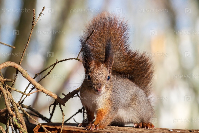 Рыжая белка с пушистым хвостом смотрит в камеру. позирует
