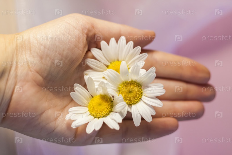 Женская рука с белыми ромашками на светлом фоне. Концепция: мягкость и нежность, омолаживающий эффект, легкость движений. Натуральный продукт