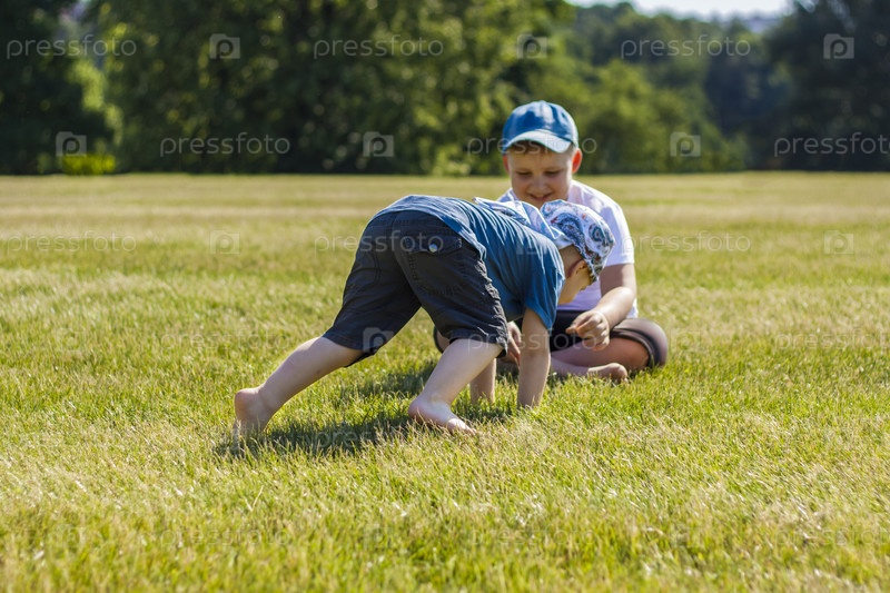 Веселые дети, два брата, радостно улыбаются. мы с удовольствием гуляем и играем на лужайке в теплую солнечную погоду в парке. эмоции детей на лице