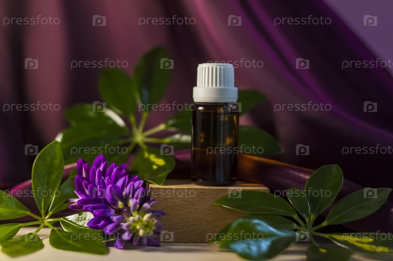 Бутылка без этикетки с маслом на подставке. Прозрачная стеклянная тара с дозатором на бежево-розовом фоне. Баннер продукта. Место для текста, дизайн