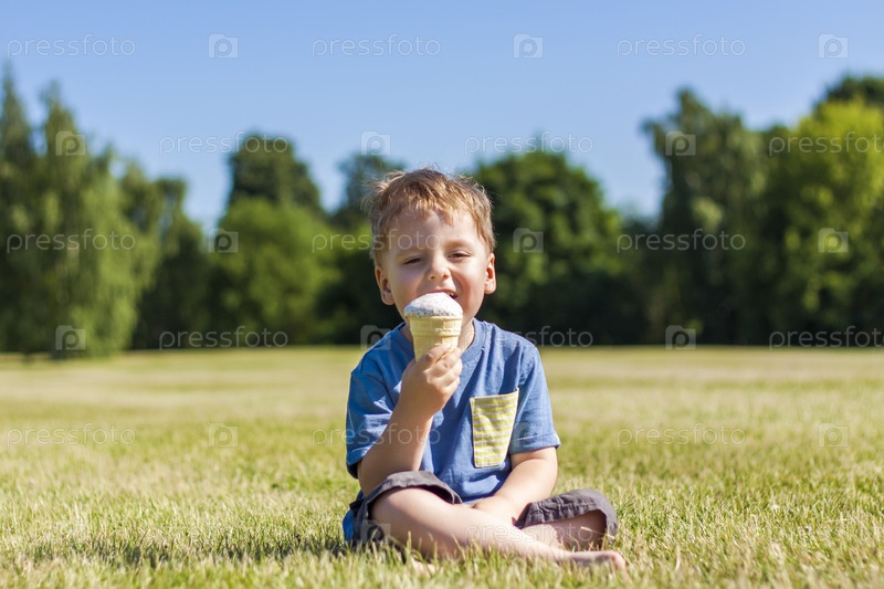 Счастливый мальчик ест мороженое на открытом воздухе в парке