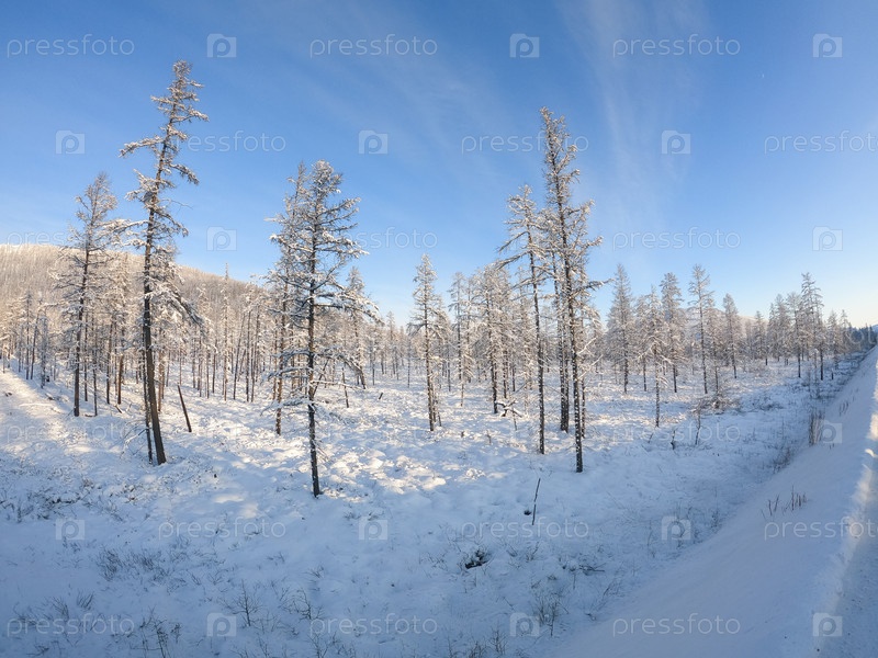 Зимний лес, заснеженные ели на склоне горы, Колыма, Якутия, Россия