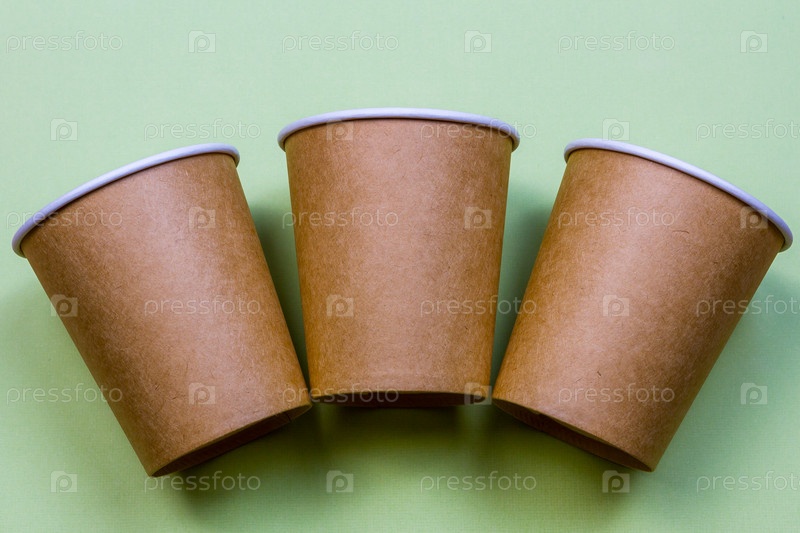 Три бумажных стаканчика из эко-крафт-бумаги на зеленом фоне