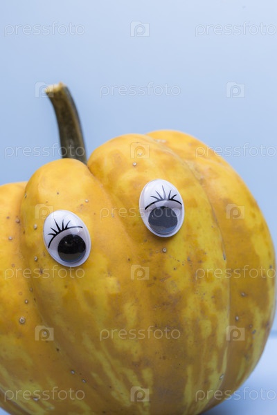 Забавная перезрелая тыква с глазами на голубом фоне
