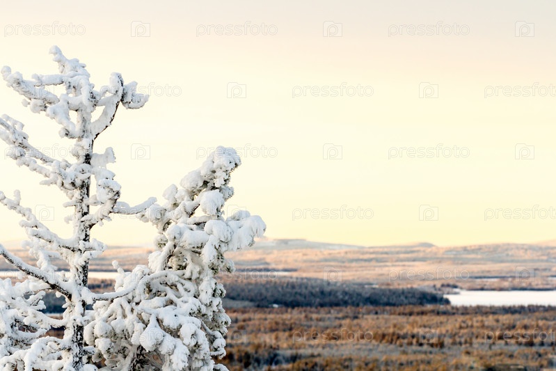 Снежный пейзаж с елкой, покрытой снегом. Зимний фон с копией пространства