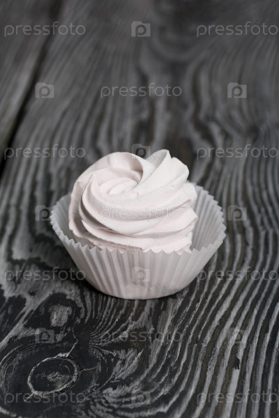 Зефир в бумажной миске. На сосновых досках. Крупный план