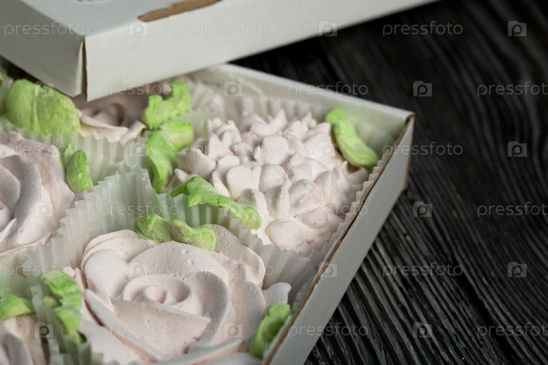 Зефир цветы. Зефир в картонной коробке. На сосновых досках. Крупный план