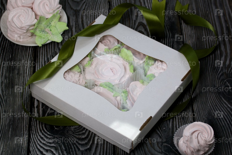 Зефир цветы. Зефир в картонной коробке. Рядом образцы зефира. Лента для обвязки коробки. На сосновых досках