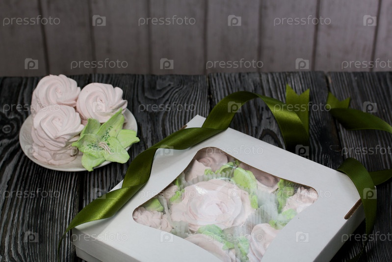 Зефир цветы. Зефир в картонной коробке. Рядом образцы зефира. Лента для обвязки коробки. На сосновых досках