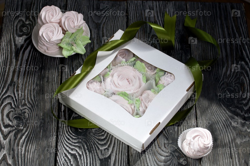Зефир цветы. Зефир в картонной коробке. Рядом образцы зефира. Лента для обвязки коробки. На сосновых досках