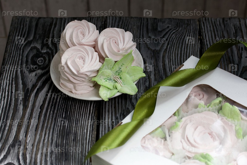 Зефир цветы. Зефир в картонной коробке. Рядом образцы зефира. Лента для обвязки коробки. На сосновых досках