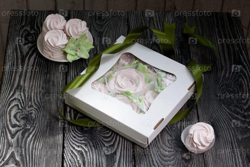 Зефир цветы. Зефир в картонной коробке. Рядом образцы зефира. Лента для обвязки коробки. На сосновых досках