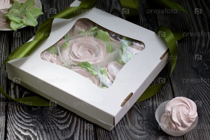 Зефир цветы. Зефир в картонной коробке. Рядом образцы зефира. Лента для обвязки коробки. На сосновых досках